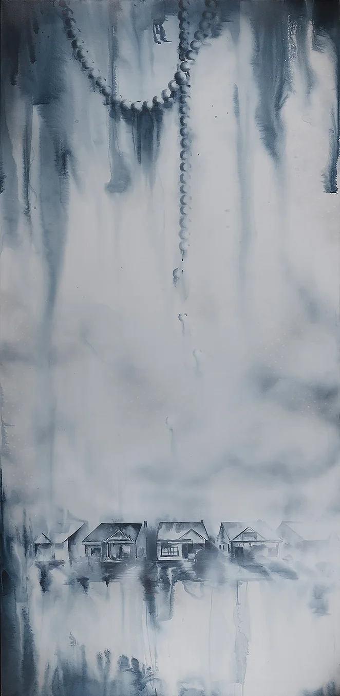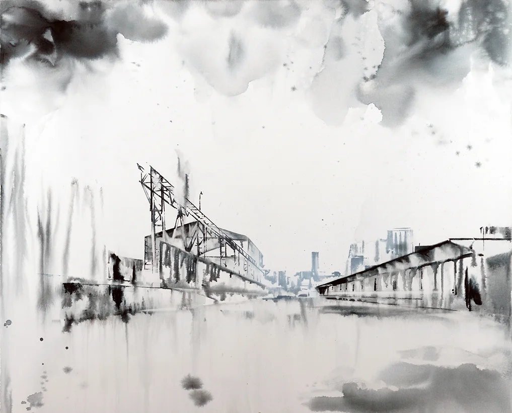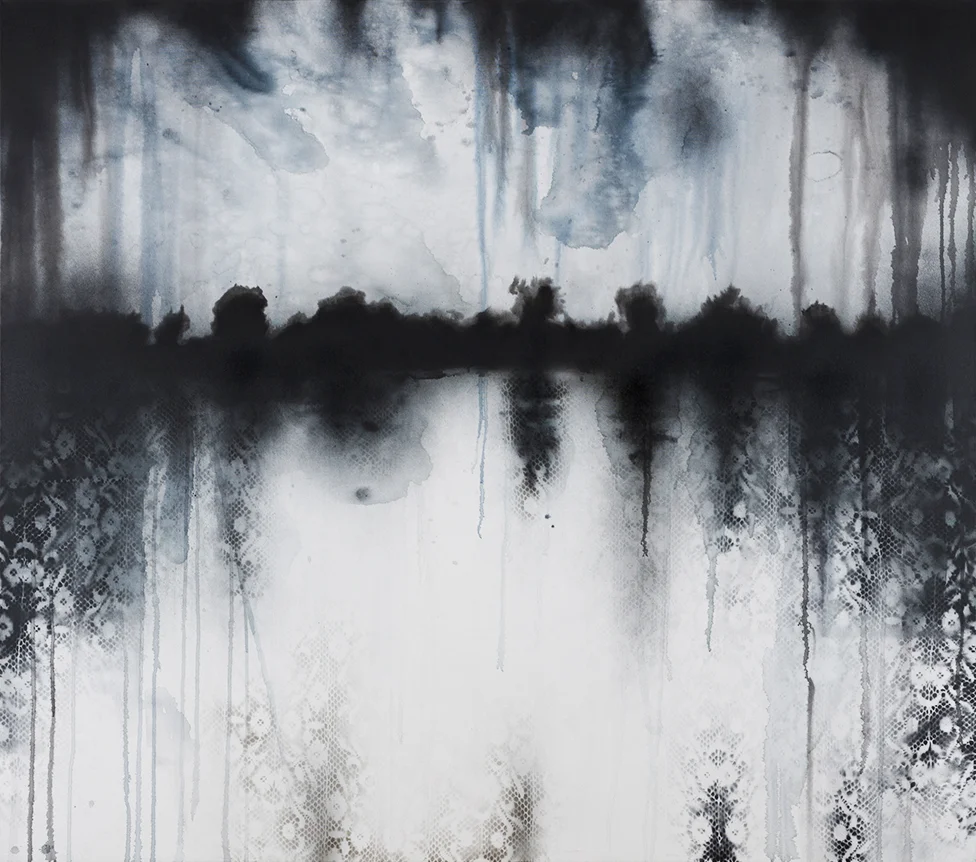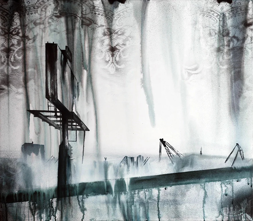Lucia Tallová (1985) is a young painter who studied in Ivan Csudai’s studio at the Fine Arts Academy in Bratislava. She defined her artistic direction early on, starting to focus her creative explorations and to defend her stance while still a student at university. Lucia works with landscape motifs, which have become the primary subject of her artistic investigations, and her efforts have resulted in a very unique artistic expression of this subject matter. Landscape as an independent theme is a newly re-discovered field of contemporary visual art. It has always offered ever new artistic and thematic options, and now it is gradually expanding into ever wider artistic contexts. This artist’s presentation of landscape is a suggestive interpretation of her personal view of this aspect of reality, with a slightly sentimental or romanticizing touch. Ms. Tallova mainly uses the contrast of urban or industrial environments with the motif of lace, the raster of which she transfers to the canvas in more or less distinct layers. This achieves unique visual effects, as if she has stamped her paintings with a touch of nostalgia and intimacy, inducing in the viewer an emotional apprehension of the apparent existence of intimate personal memories imprinted on the cold, impersonal backgrounds of locales such as factories, ports, concrete apartment blocks, or abandoned megalomaniacal building complexes. In her drawings, graphics and light boxes, she also processes emotions in her own, highly unique way, working with the motif of black drops, a frequent image in her works. The drops can symbolize a woman’s crying (melted mascara) but also polluted rain in big cities. Lucia Tallová does not avoid motifs that are usually considered exclusively feminine, gentle and aestheticizing. Perhaps that is why her paintings have now assumed an irreplaceable role among the collective works of young Slovak artists. In addition to the attention she receives from galleries and magazines (the latest article was in The Profile of Contemporary Fine Art), her artwork has received awards in distinguished art contests (e.g., the Strabag Art Award and the VUB Painting of the Year)